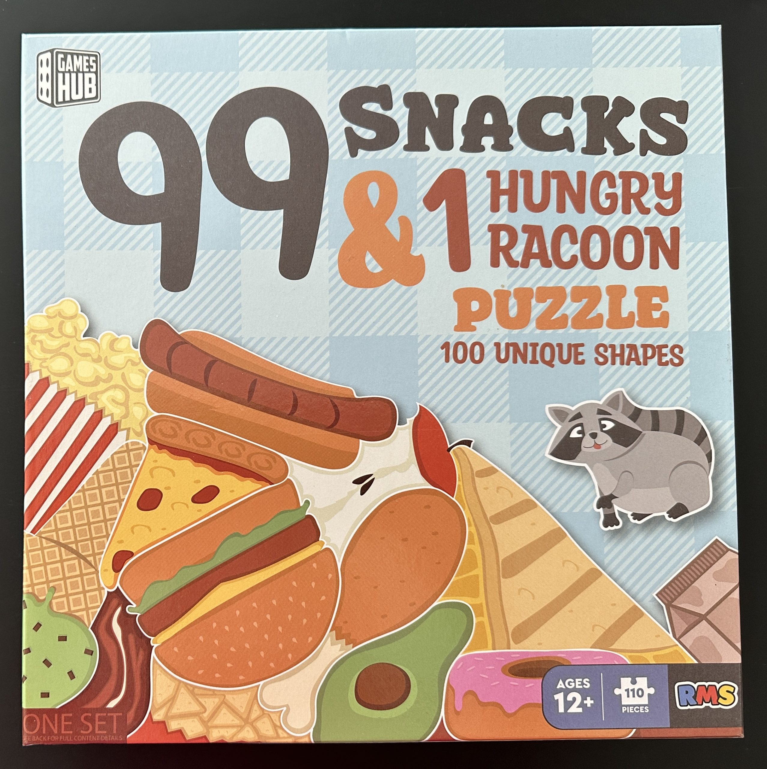 A013 – Games Hub – Shaped – 20″ x 20″ – 99 Snacks & 1 Hungry Racoon – 110 Piece